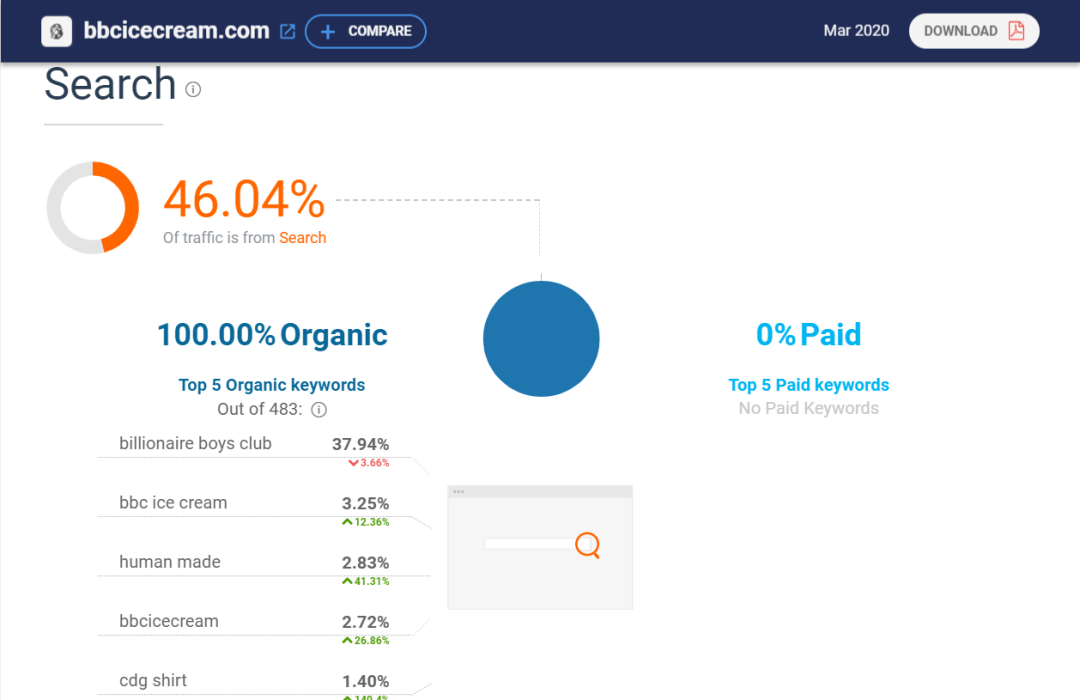 在搜索流量中,并没有做付费搜索流量,而是全部布局了自然搜索流量,对超过483个关键词进行了SEO优化,图中所示的是流量排名前5位的关键词,仅billionaire boys club这一关键词,就占据37.94%的搜索流量的比重。
