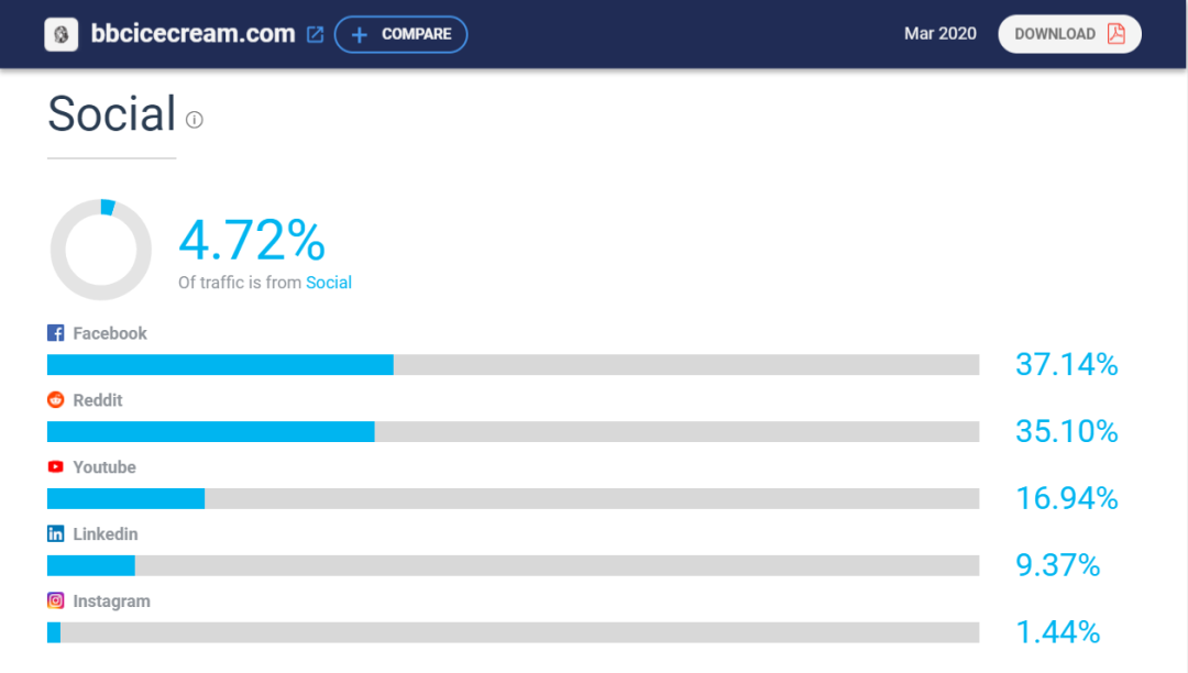 Bbcicecream主要布局了Facebook、Reddit、YouTube、Linkedin等社交渠道,主要的社交流量来源于Facebook、Reddit。